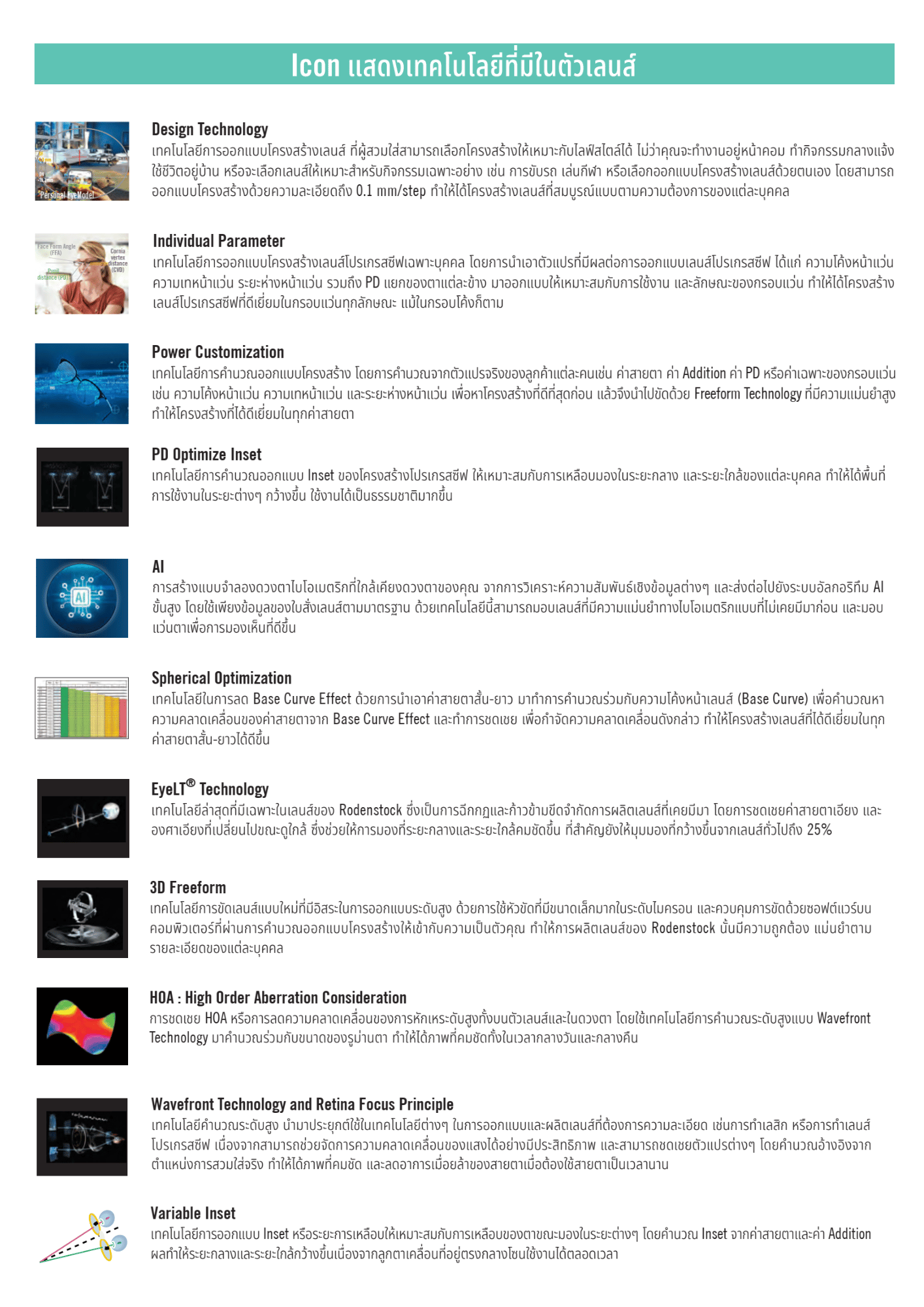 เลนส์ที่ใช้เทคโนโลยีการผลิตที่ผ่านการคิดค้นและพัฒนามาอย่างยาวนาน เพื่อให้ได้เลนส์ที่ดีที่สุดในด้านการมองเห็น เหมาะสมกับลักษณะสรีระร่างกาย เพื่อให้ผู้ใช้งสนใช้งานอย่างมีประสิทธิภาพเพิ่มมากขึ้น