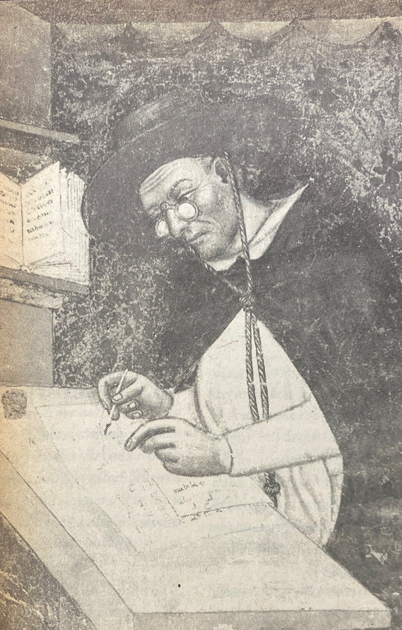 ภาพนักบวชที่มีชื่อว่า Tommaso da modena ขณะสวมแว่นตา เป็นภาพที่เก่าแก่ที่สุดที่ปรากฏคนสวมใส่แว่นตา (ภาพจาก ศิลปวัฒนธรรม ฉบับตุลาคม 2531)