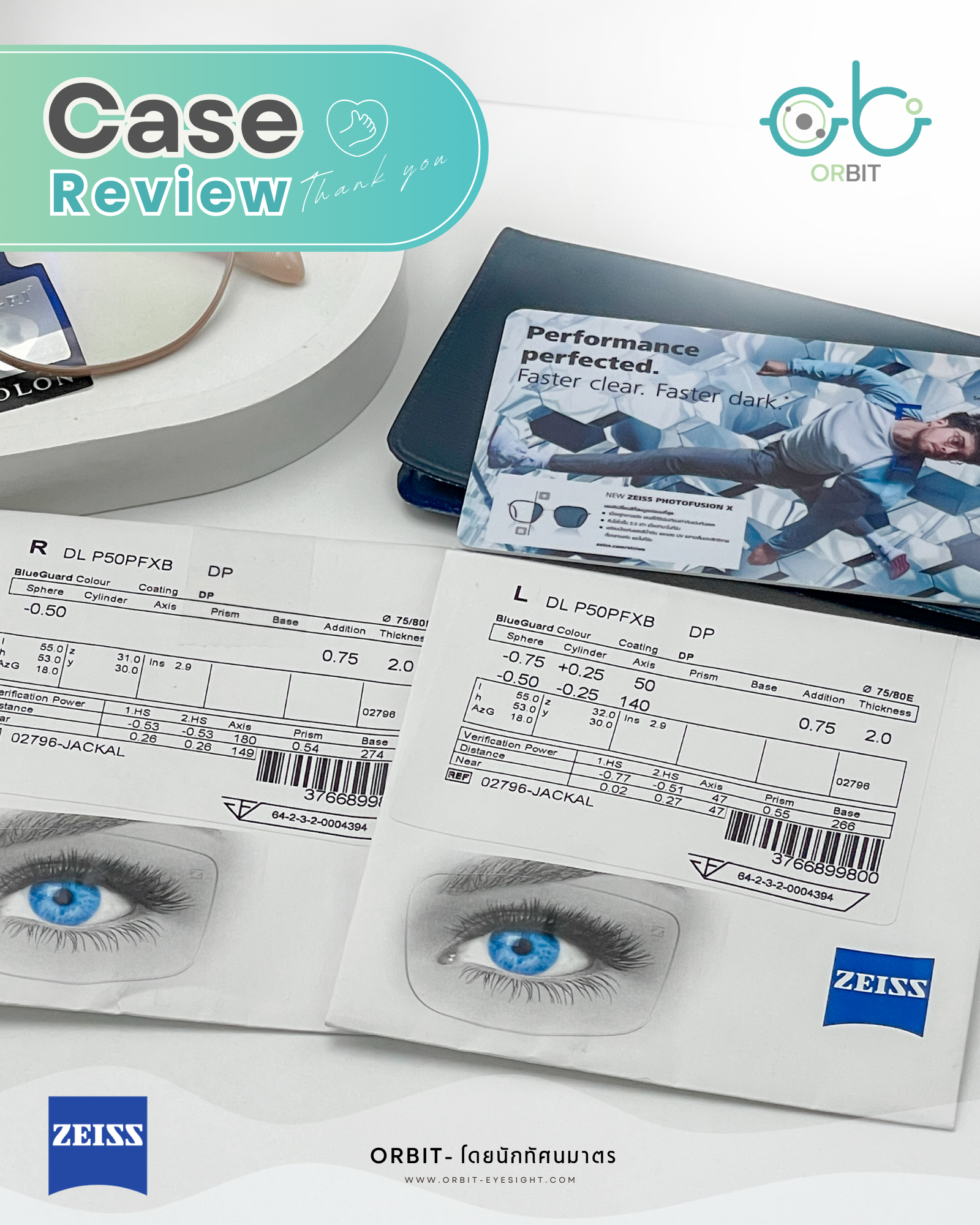 คุณลูกค้าไม่เคยใส่แว่นสายตามาก่อน มีอาการเวลามองระยะไกลๆเบลอ และบางครั้งมองระยะใกล้ก็เบลอๆมีอาการปวดหัวปวดตาและมีตาล้าร่วมด้วยเวลาใช้สายตาทำงานหน้าจอคอมพิวเตอร์เยอะๆ จึงต้องการมาตรวจวัดสายตาและตัดแว่นสายตา หลังตรวจวัดค่าสายตากับนักทัศนมาตรได้ค่าสายตา OD : -0.50 , OS : -0.50-0.25x140 Add+0.75 คุณลูกค้าเน้นใช้งานคอมพิวเตอร์เป็นหลักวันละประมาณ8-12ชั่วโมง/วันและอยากได้ตัวเลนส์ที่กรองแสงสีฟ้าจากหน้าจอคอมพิเตอร์ได้และอยากได้ตัวเลนส์มีสามารถออกแดดเปลี่ยนสีได้ด้วยเนื่องจากบางครั้งที่มีอาการตาล้าเวลาเจอแดดชอบรู้สึกว่าตาระคายเคืองต่อแสงง่าย
