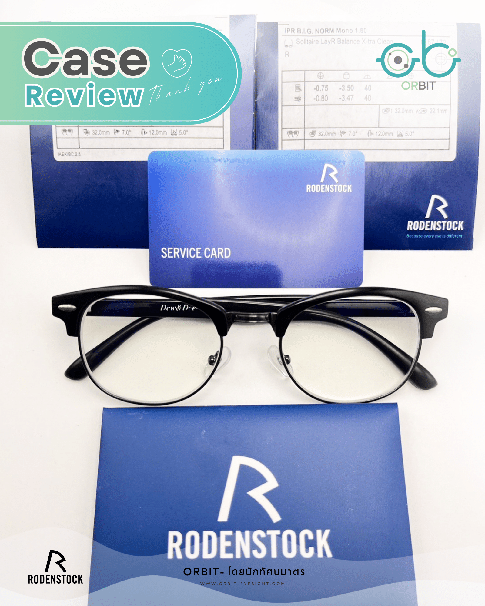 คุณลูกค้ามีปัญหาจากการใส่แว่นแล้วมองเห็นภาพซ้อนกัน ทำให้เวลาใส่แว่นแล้วเวียนหัวปวดหัวมาก จึงต้องการอยากตัดแว่นตาใหม่ หลังจากตรวจวัดสายตากับนักทัศนมาตรได้ค่าสายตา OD: -0.75-3.50x40 , OS: -0.75-3.00x170 เนื่องจากคุณลูกค้ามีค่าสายตาเอียงสูงและมีค่าสายตาสองข้างที่ไม่เท่ากันแต่คุณลูกค้าเน้นพิมพ์งานเอกสารต้องใช้งานหน้าจอคอมพิวเตอร์ค่อนข้างเยอะจึงอยากได้เลนส์ที่กรองแสงสีฟ้าด้วย ทางร้านจึงแนะนำเลนส์ Rodenstock Impression B.I.G norm Mono Solitaire LayR Balance 1.60 เป็นเลนส์ที่มีเทคโนโลยี individual parameter พร้อมกับการขัดเลนส์แบบ Backside Multi-Aspheric Atoric Design และมี AI Technology ที่วิเคราะห์ข้อมูลให้ใกล้เคียงกับดวงตาจริงของผู้สวมใส่ ทำให้ได้เลนส์ที่คมชัดกับทุกค่าสายตาแล้วตัวเลนส์ยังช่วยกรองแสงสีฟ้าจากจอคอมพิวเตอร์เพื่อถนอมสุขภาพดวงตา และด้วยindex1.60 ทำให้ตัวเลนส์มีความบางและมีน้ำหนักที่เบามากยิ่งขึ้นทำให้เวลาสวมใส่สบายมากขึ้น