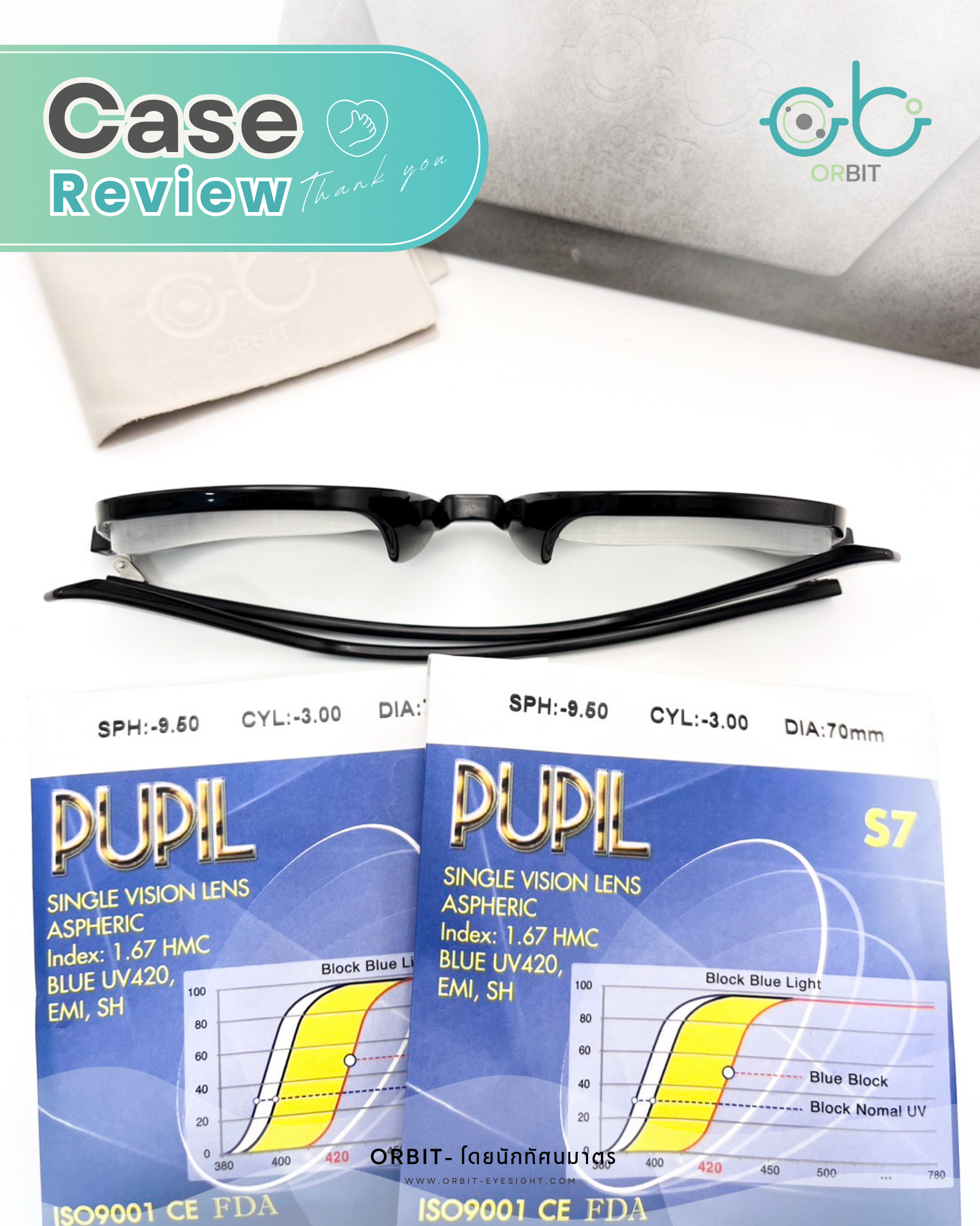 คุณลูกค้ามีอาการมองระยะไกล มองแทบไม่เห็นเลย และมองเห็นภาพซ้อนทับกันเป็นบางครั้ง ค่าสายตาเก่าของคุณลูกค้า OD: -9.00 , OS: -9.00 หลังจากตรวจวัดค่าสายตากับนักทัศนมาตรได้ค่าสายตา OD: -9.50-3.00x165 , OS: -9.50-3.00x165