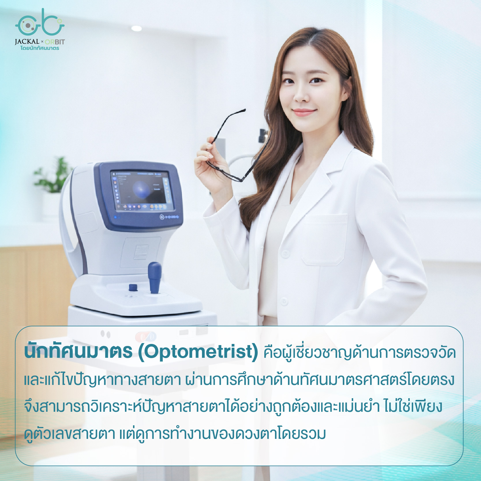 นักทัศนมาตร (Optometrist) คือผู้เชี่ยวชาญด้านการตรวจวัดและแก้ไขปัญหาทางสายตาผ่านการศึกษาด้านทัศนมาตรศาสตร์โดยตรง ทำให้สามารถวิเคราะห์ปัญหาสายตาได้อย่างถูกต้องและแม่นยำไม่ใช่เพียงดูตัวเลขสายตา แต่ดูการทำงานของดวงตาโดยรวม