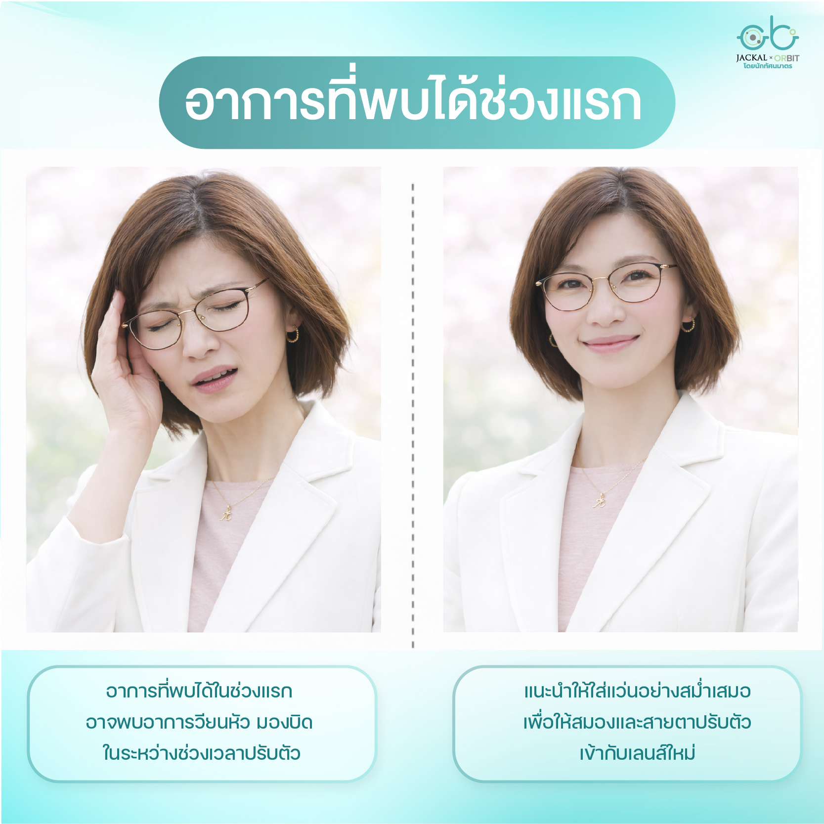 วิธีแก้: พยายามใส่แว่นอย่างต่อเนื่อง (ห้ามสลับไปใส่แว่นเก่า) เพื่อให้สมองจดจำจุดโฟกัสใหม่ได้เร็วขึ้น