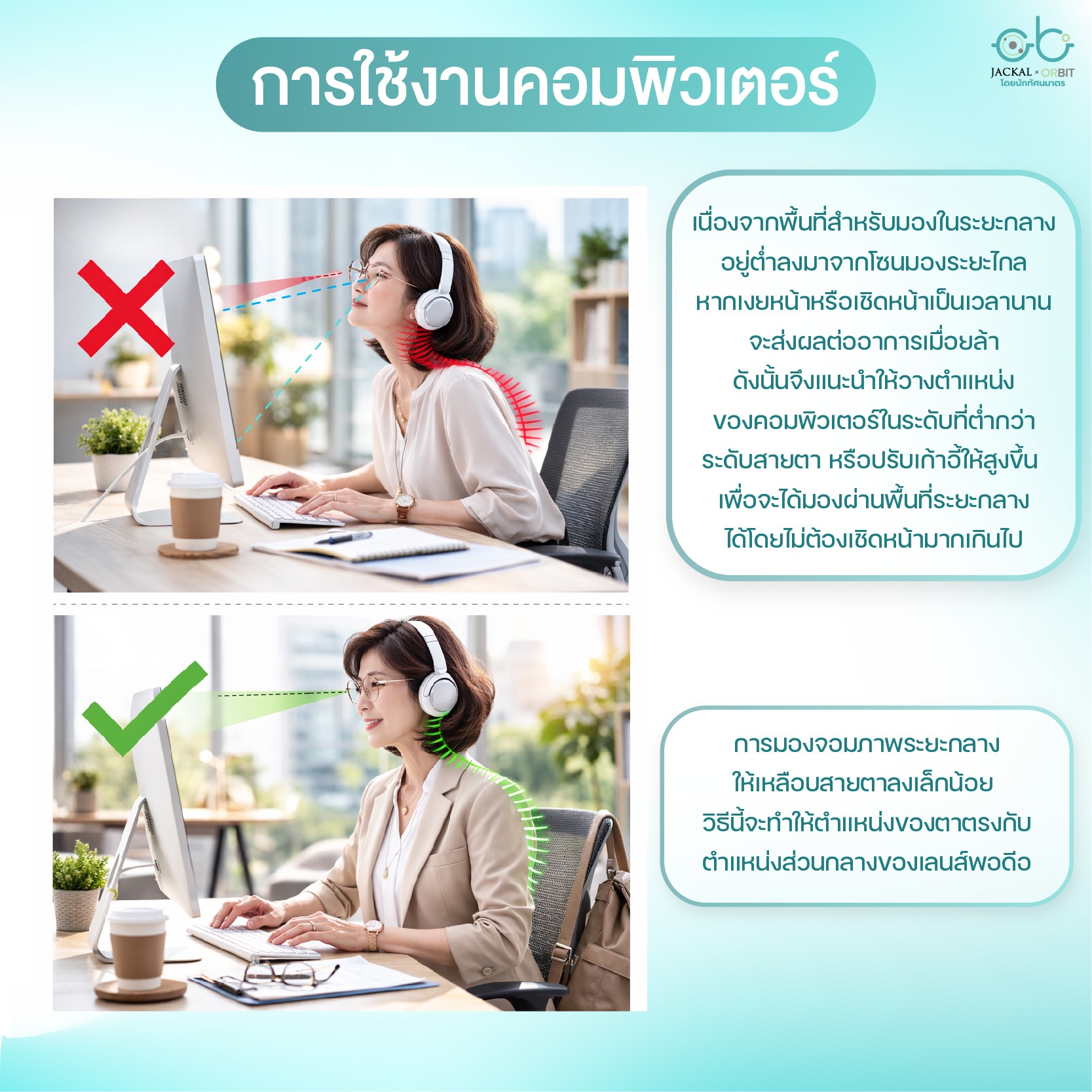 การปรับท่าทาง: อาจจะต้องเชิดหน้าขึ้นเล็กน้อย (ประมาณ 5-10 องศา) เพื่อหาจุดที่ตัวอักษรบนจอชัดที่สุด และควรวางจอคอมพิวเตอร์ให้อยู่ต่ำกว่าระดับสายตาเล็กน้อย