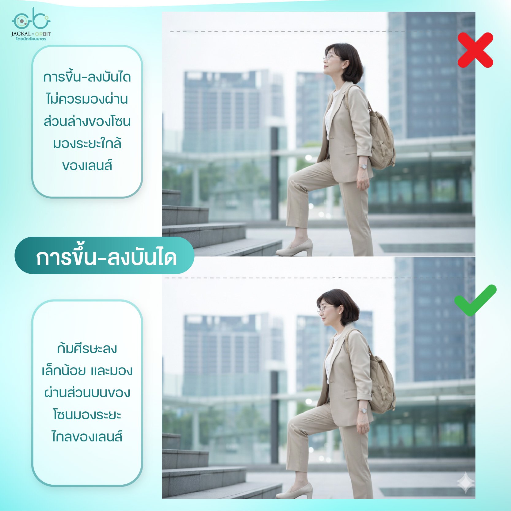 เทคนิค: "ก้มหน้ามองบันได" มากกว่าปกติ เพื่อให้สายตามองผ่านเลนส์ ส่วนบน (ระยะไกล) แทนการมองผ่านส่วนล่าง