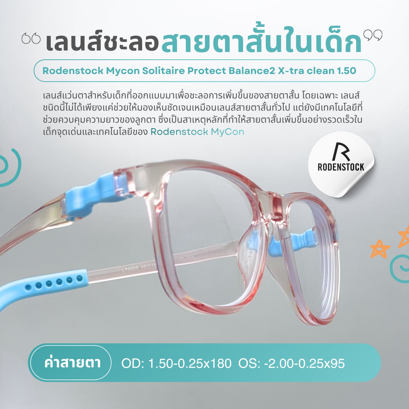 - คุณพ่อค่อนข้างกังวลเนื่องจากน้องไม่เคยใส่แว่นตามาก่อนจึงอยากได้ตัวเลนส์ที่ช่วยชะลอสายตาสั้นได้ ทางร้านจึงแนะนำเป็น Rodenstock Mycon Solitaire Protect Balance2 X-tra clean 1.50