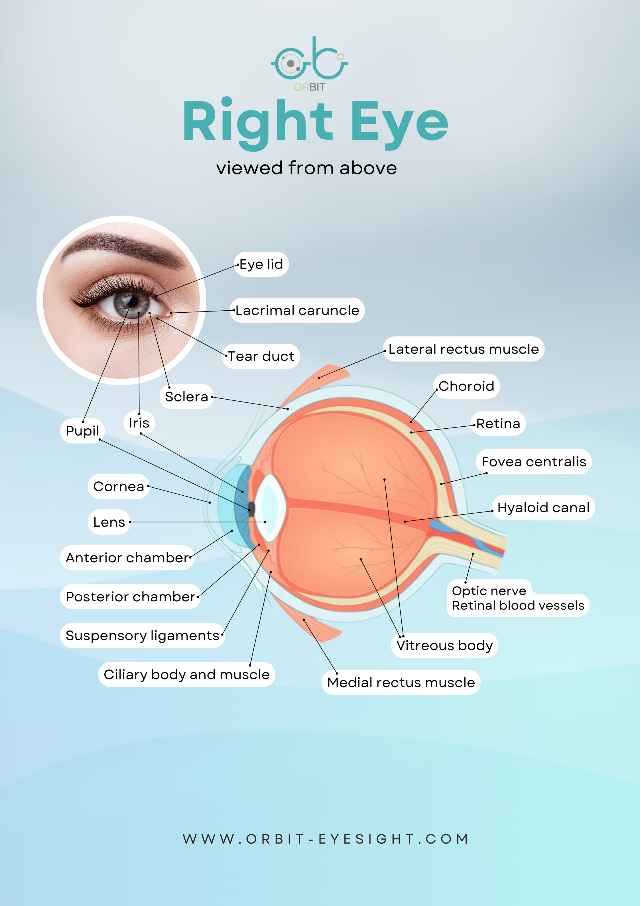 ดวงตาหรือลูกตาแบ่งออกเป็น3ส่วน:ลูกตาส่วนหน้าคือตั้งแต่กระจกตาถึงม่านตา